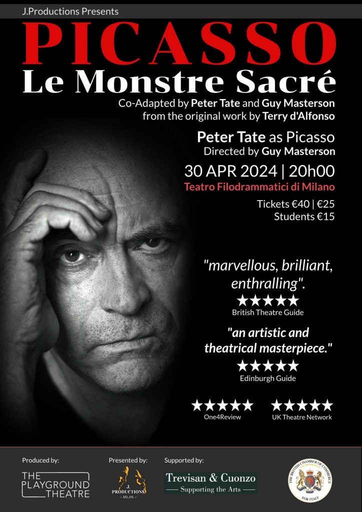 A visceral, uncompromising portrait of Pablo Picasso 50 years after his death…Undisputed genius, visionary artist, yet Picasso’s obsession often destroyed those he professed to love…. Brilliantly incarnated by Peter Tate, in a challenging, powerful, intelligent study, Picasso passionately defends his reputation. It’s an explosive, deeply passionate voyage of self-revelation, leaving the audience as his jury… Should we condemn or forgive?