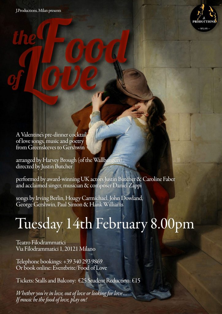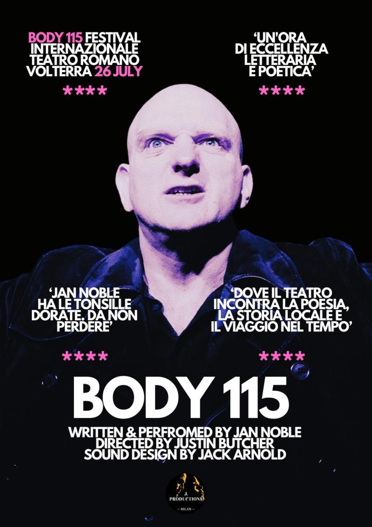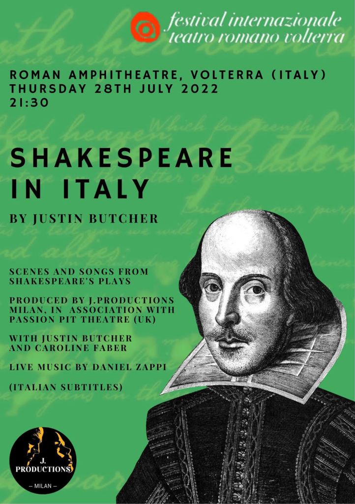 In early 2023 J. Productions presented The Last Cuckoo by Nigel Forde performed as a one-man show by Andrew Harrison and Food for Love, a Valentine’s evening of poetry, music and love songs directed by Justin Butcher. In Summer 2023 J. Productions presented Jan Noble’s lyrical and poetic trans-European Dantesque journey of the soul, Body 115, at the International Roman Theatre Festival in Volterra. In Autumn 2023 J. Productions presented Daniel Zappi’s Shakespeare in Song to the All Saints’ Anglican Church as a Charity project.